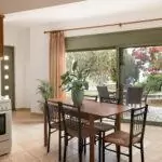 It features a large living area with a dining table and a fully equipped open kitchen. The sofa in the living room can be converted to a double bed.